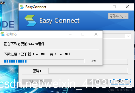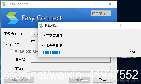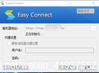 双击easyconnect打开软件,主界面如下图所示,输入服务器地址,这个地址一般是公司或校园的vpn地址,点击“连接”即可。界面显示正在初始化,等待一段时间后,即可进入帐号登录界面。
