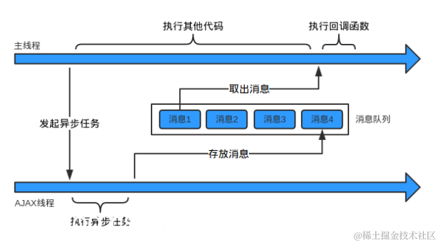主线程在执行完当前循环中的所有代码后,就会到消息队列取出这条消息(也就是 message 函数),并执行它。到此为止,就完成了工作线程对主线程的通知,回调函数也就得到了执行。如果一开始主线程就没有提供回调函数,AJAX 线程在收到 HTTP 响应后,也就没必要通知主线程,从而也没必要往消息队列放消息。