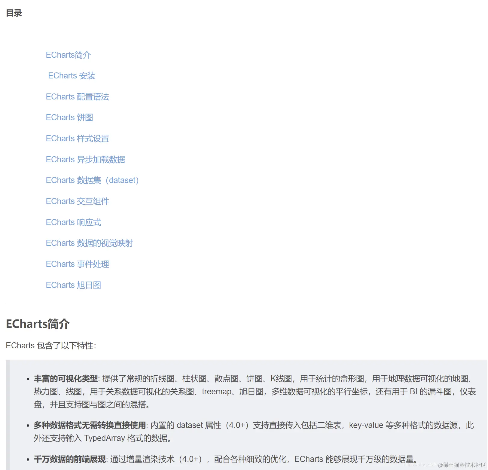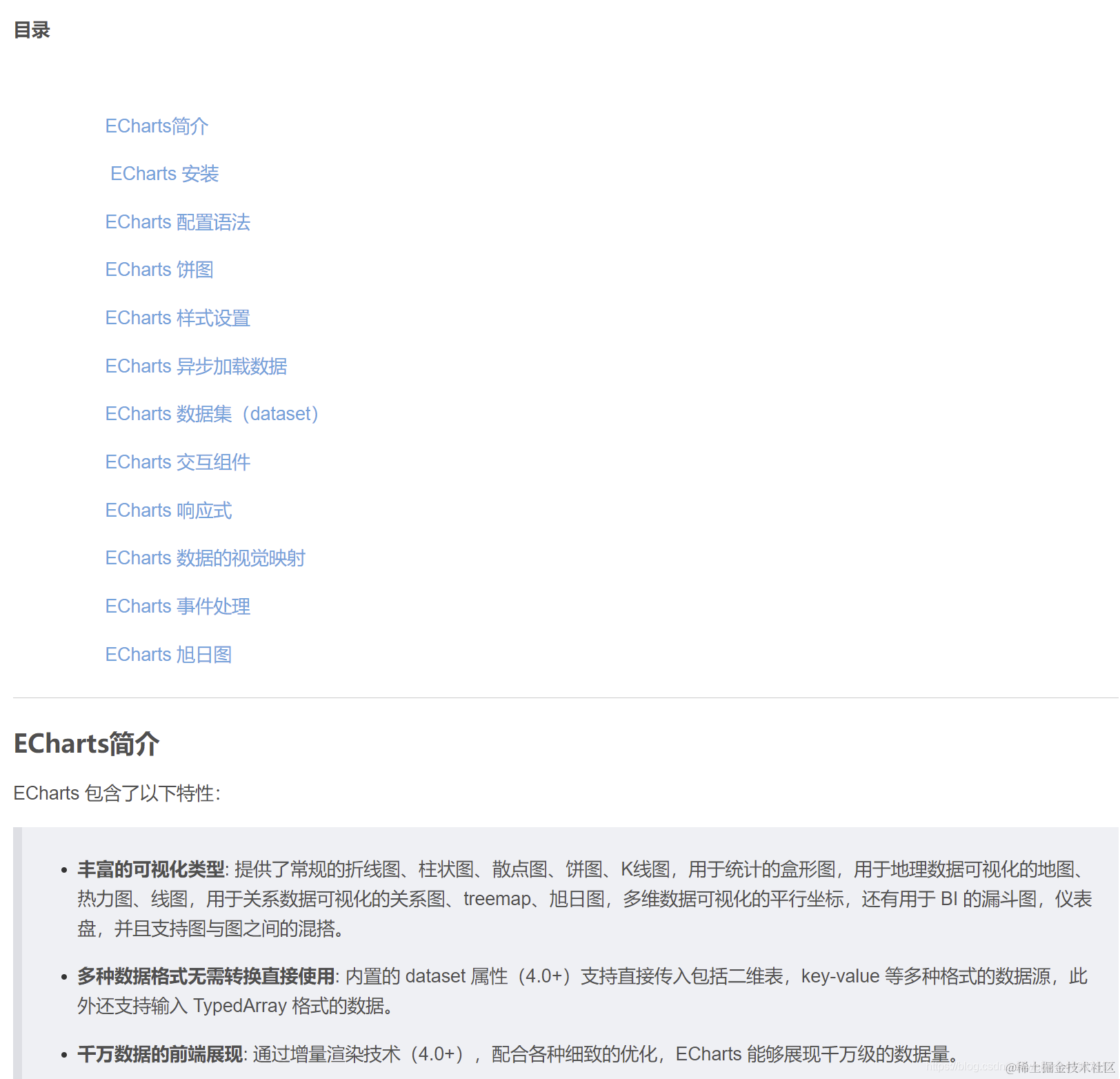 第一篇为Echarts入门文档,如果没有Echarts基础,理解起来比较费劲,这个需要建立在有一定的编程基础的前端开发人员,最起码要掌握html+css+javascript.