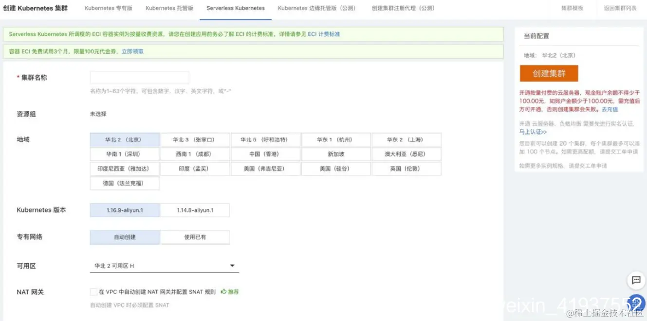 在对 Serverless Kubernetes 的基础概念有了充分了解之后,我们直接进入容器服务控制台进行集群的创建。集群创建完成后,接下来我们部署一个无状态的 nginx 应用,主要分成三步: