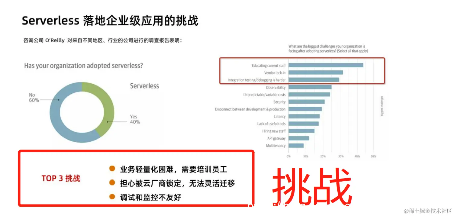 2.担心被云厂商锁定,如 FaaS 形态的 Serverless 产品,每个厂商都希望推出自己的 标准,缺乏开源的规范和开源的生态支持。相似的一幕曾经在容器领域上演,直到后来 Kubernetes 成为事实标准,Serverless 还在寻找自己的事实标准;