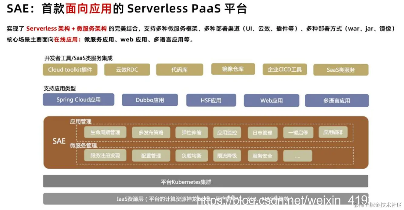 低门槛,无需任何代码改造就能直接使用的 Serverless PaaS 平台(SAE),是企业在线业 务平滑上云的最佳选择。