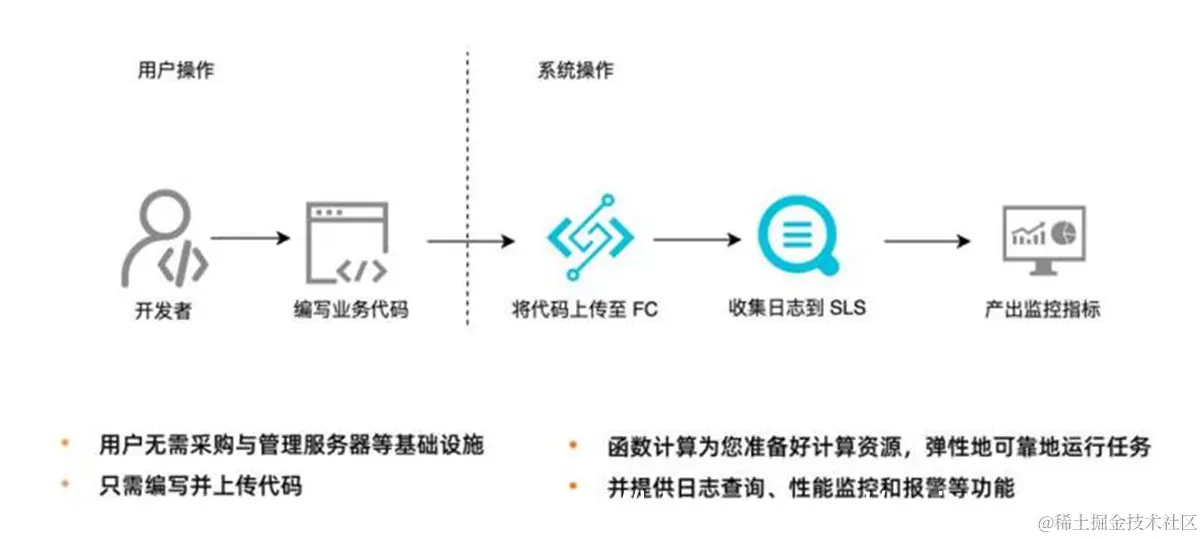 从用户角度,他需要做的只是编码,然后把代码上传到函数计算中。上传代码就意味着应用部署。当有高并发请求涌入时,开发者也无需手动扩容,函数计算会根据请求量毫秒级自动扩容,弹性可靠地运行任务,并内置日志查询、性能监控、报警等功能帮助开发者发现问题并定位问题。