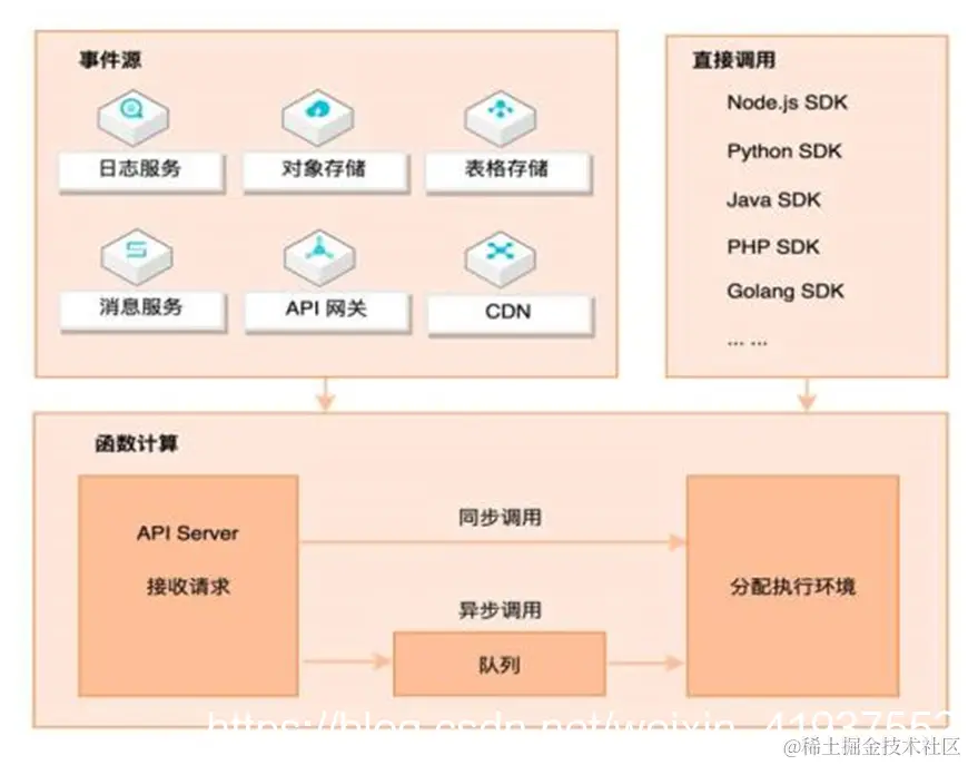 除了事件触发外,也可以直接通过API/SDK直接调用函数。调用可以分为同步调用与异步调用,当请求到达函数计算后,函数计算会为请求分配执行环境,如果是异步调用,函数计算会将请求事件存入队列中,等待消费。