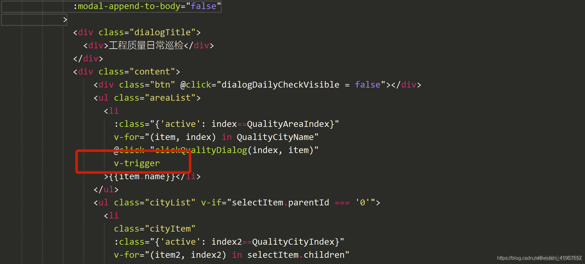 vue点击弹窗自动触发点击事件的解决办法 孙叫兽 2021-06-28 572 阅读1分钟 业务场景:使用vue +element ui 的el-dialog,点击弹窗之后,默认加载第一个按钮的数据进行初始化。 div 指令: // 自动触发点击事件 directives:{ trigger:{ inserted(el,binging){ // console.log("自动触发事件") el.click() } } },