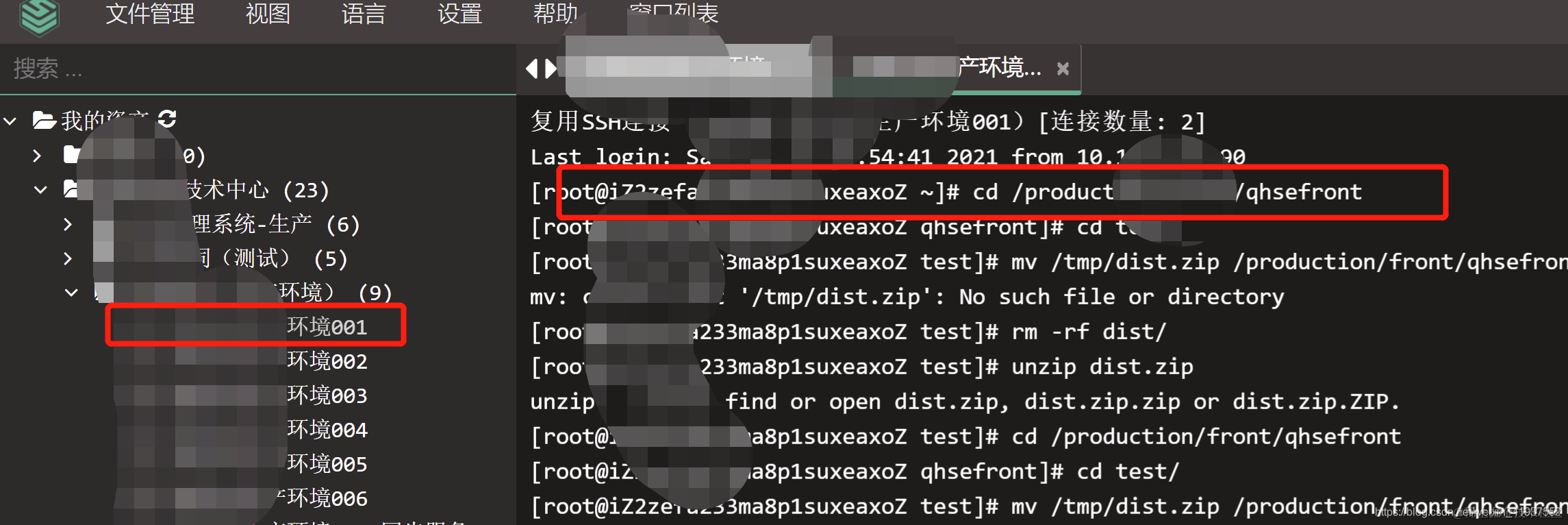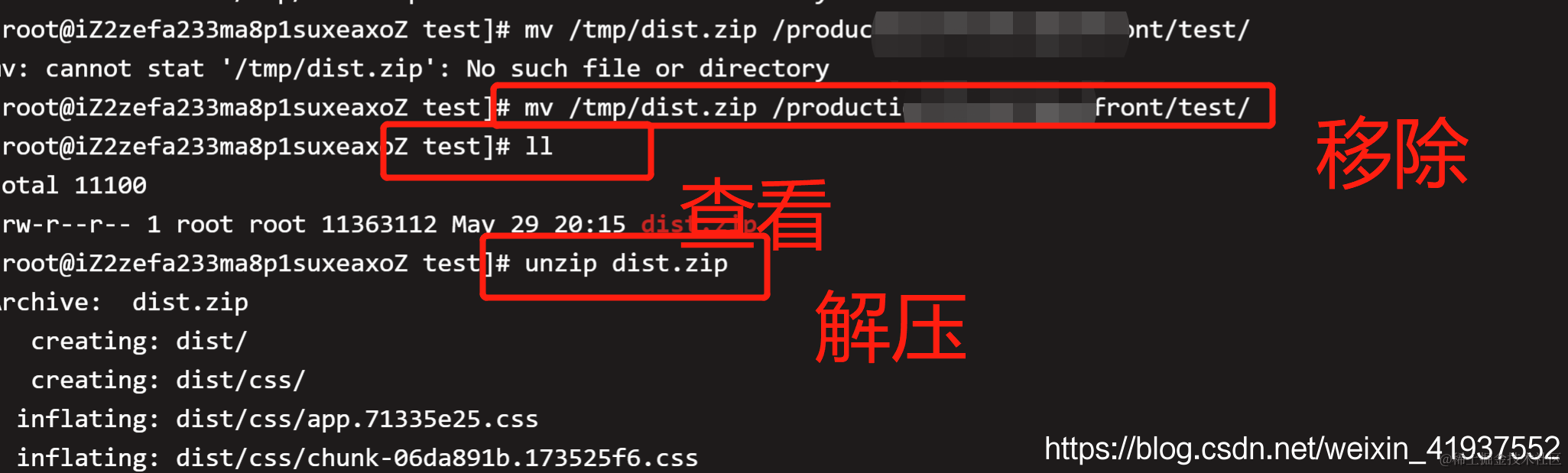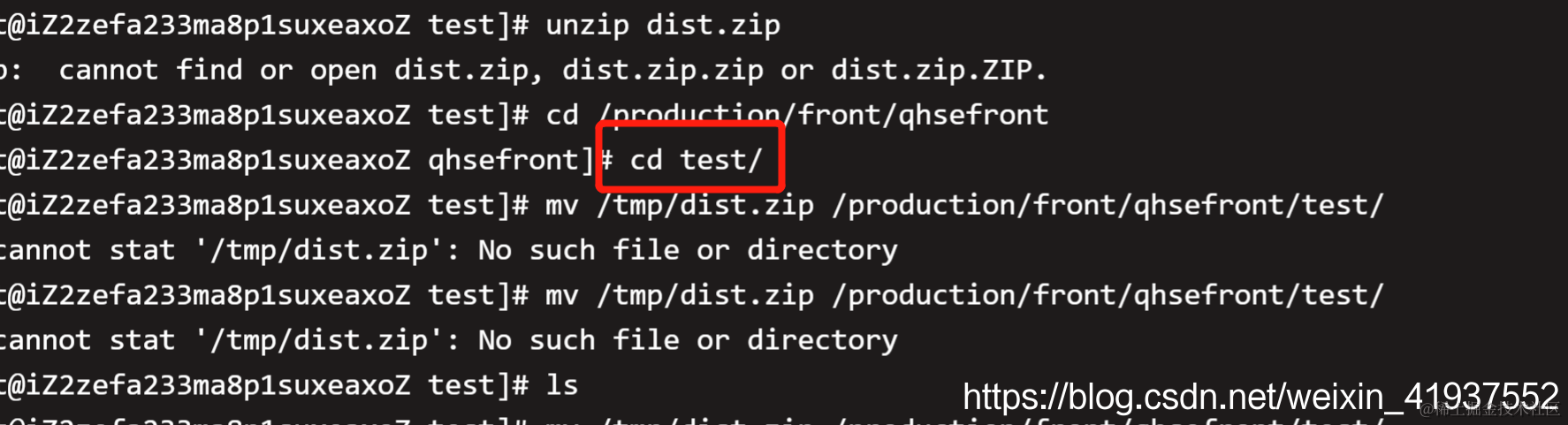 5.删除文件夹:mv /tmp/dist.zip /production/front/qhsefront/test/