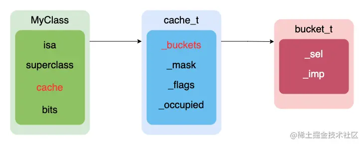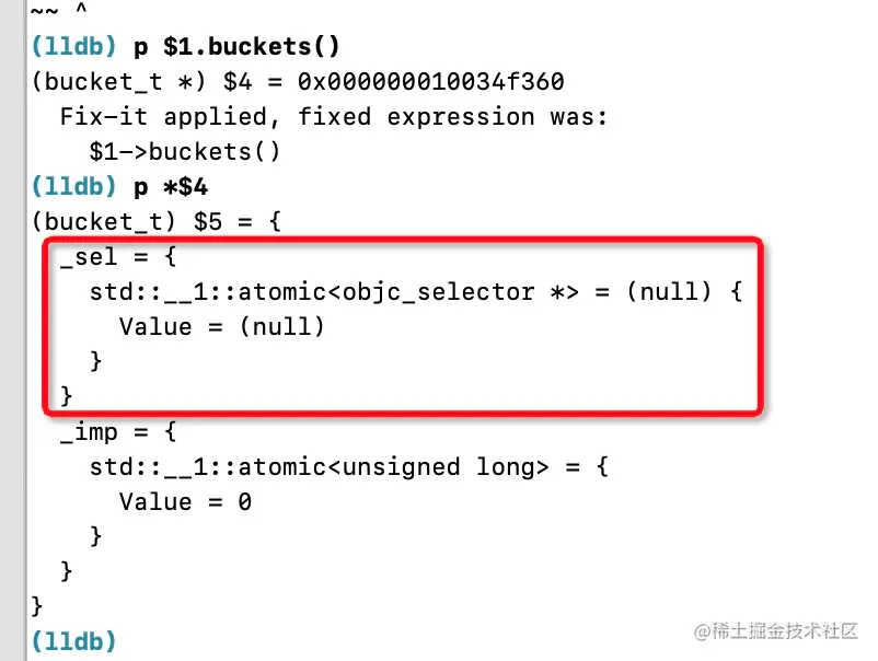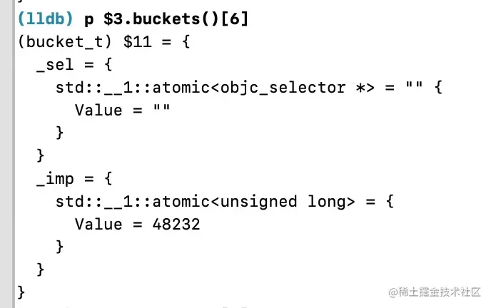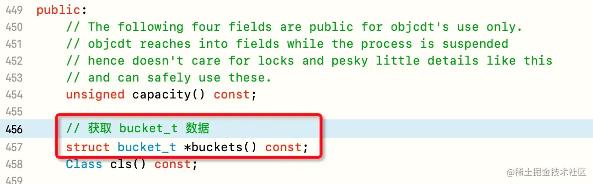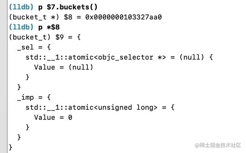 因为最终存储的数据是 bucket_t ,所以还需要模拟下 bucket_t 的实现,由于之前论证 sel 和 imp 是通过 buckets() 获取的,所以具体看一下 buckets() 方法实现: