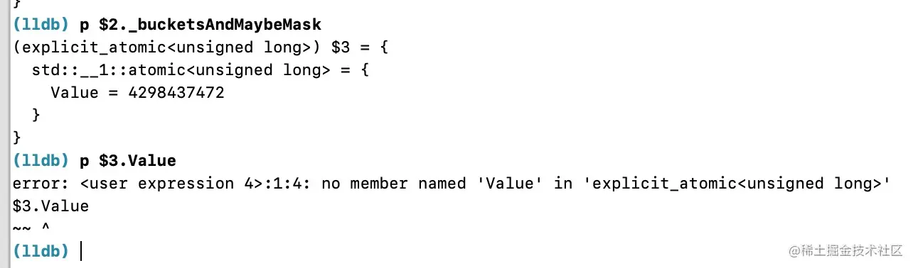 但是直接通过 _bucketsAndMaybeMask 是拿不到数据的。同样的 _originalPreoptCache 的 Value 也获取不到。