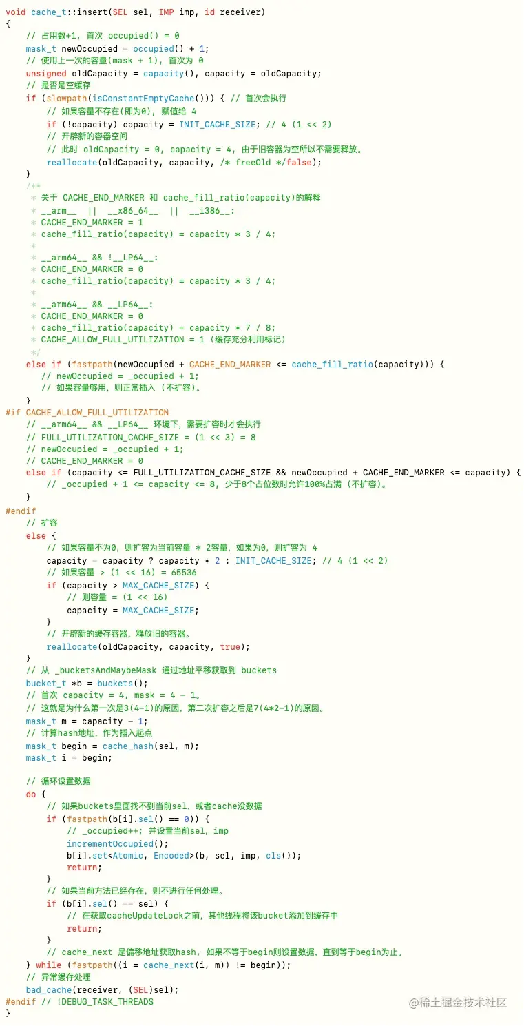 mask = capacity - 1,这就是为什么第一次是3(4-1),第二次扩容之后是7(4*2-1)的原因。占了一位存储的是end_bucket_t,格式为(sel-imp)0x1-buckets 指针地址)
