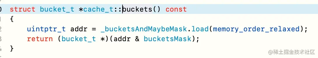 _bucketsAndMaybeMask通过load获取地址,再通过bucketsMask掩码获取bucket_t *数据。其实就是_bucketsAndMaybeMask指向bucket_t *数据。
