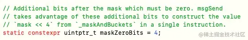 4位为附加位,且必须为零。为objc_msgSend使用。objc_msgSend会使用这些附加位单个指令标明是来自_maskAndBuckets的值。后面再详细探究。