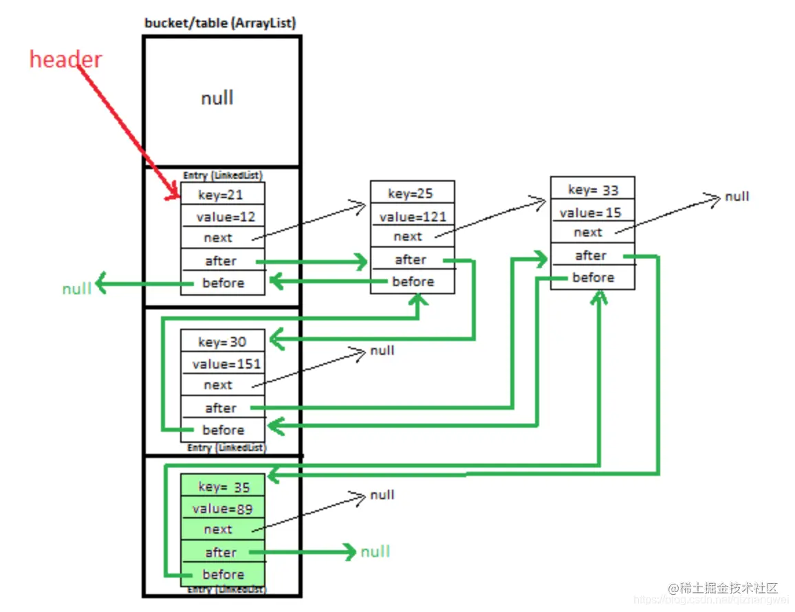 * LinkedHashMap实现Map的接口,和HashMap不同的是维持了一个所有entries的双向链表,