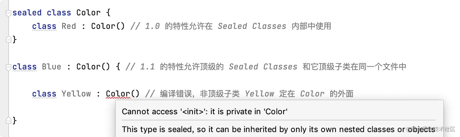 正如你所见 Sealed Classes 还是不够灵活,非顶级子类 Yellow 定在 Color 的外面,编译就会出错,而在 Koltin 1.5.0 放宽了限制之后,以上代码可以正常编译通过,不仅提高代码的可读性,而且灵活性也提高了。