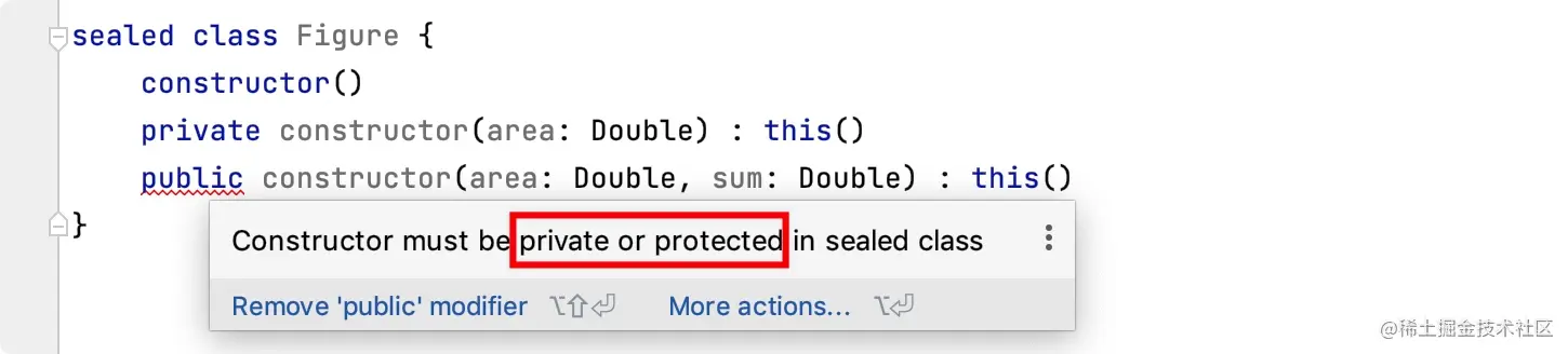 除此之外还允许在 Sealed Classes 中声明受保护的构造函数。在 1.5.0 之前所有 Sealed Classes 的默认构造函数都是 private,但是在 1.5.0 之后默认构造函数都是 protected。
