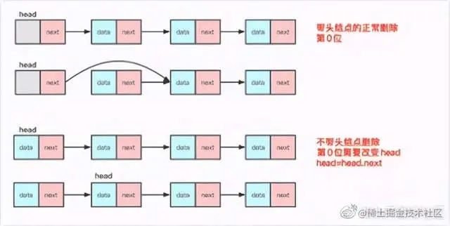 删除上:非第 0 个位置删除区别不大,不带头结点的删除第 0 号位置之后需要重新改变 head 头的指向。