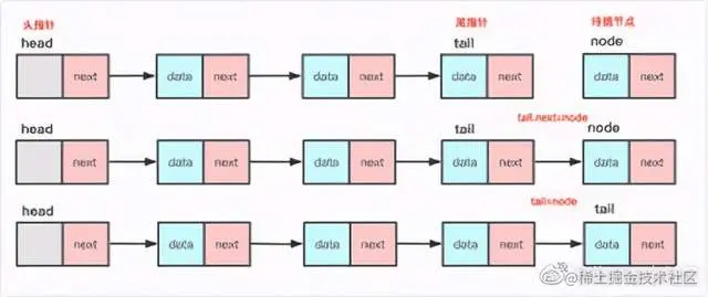 当然,很多时候链表需要插入在尾部,如果频繁的插入在尾部每次枚举到尾部的话效率可能比较低,可能会借助一个尾指针去实现尾部插入。