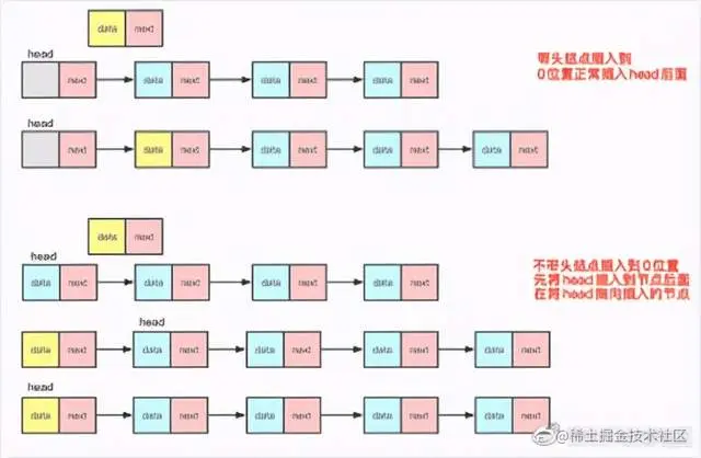 插入上:非第 0 个位置插入区别不大,不带头结点的插入第 0 号位置之后需要重新改变 head 头的指向。