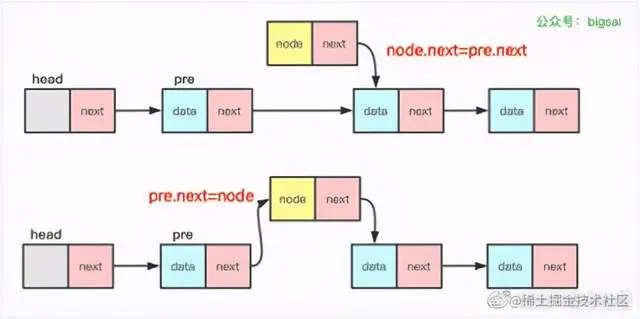 2. `pre.next=node` 将node节点插入到链表中。