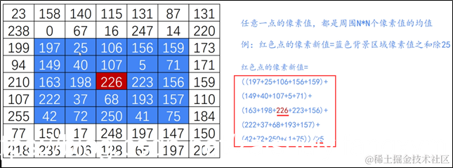 均值滤波是指任意一点的像素值,都是周围 个像素值的均值。例如下图中,红色点的像素值是其周围蓝色背景区域像素值之和除25,25=5