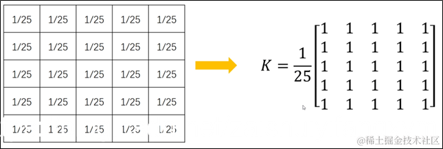 其中55的矩阵称为核,针对原始图像内的像素点,采用核进行处理,得到结果图像,如下图所示: