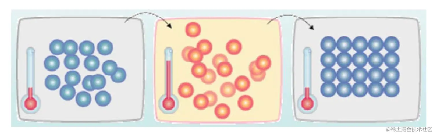 如下图所示,首先(左图)物体处于非晶体状态。我们将固体加温至充分高(中图),再让其徐徐冷却,也就退火(右图)。加温时,固体内部粒子随温升变为无序状,内能增大,而徐徐冷却时粒子渐趋有序,在每个温度都达到平衡态,最后在常温时达到基态,内能减为最小(此时物体以晶体形态呈现)。