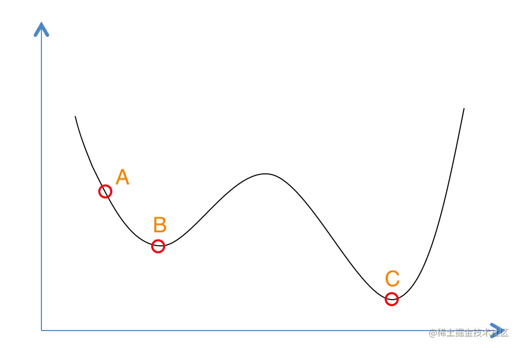 如果你对退火的物理意义还是晕晕的,没关系我们还有更为简单的理解方式。想象一下如果我们现在有下面这样一个函数,现在想求函数的(全局)最优解。如果采用Greedy策略,那么从A点开始试探,如果函数值继续减少,那么试探过程就会继续。而当到达点B时,显然我们的探求过程就结束了(因为无论朝哪个方向努力,结果只会越来越大)。最终我们只能找打一个局部最后解B。