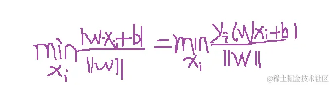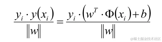 如上面假设蓝色的星星类有5个样本,并设定此类样本标记为Y =1,紫色圈类有5个样本,并设定此类标记为 Y =-1,共 T ={(X₁ ,Y₁) , (X₂,Y₂) (X₃,Y₃) .........} 10个样本,超平面(分割线)为wx+b=0; 样本点到超平面的几何距离为: