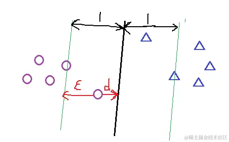 对加入松弛变量后有几点说明如下图所以;距离小于1的样本点离超平面的距离为d ,在绿线和超平面之间的样本点都是由损失的,