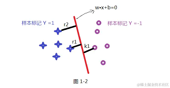 根据函数距离和几何距离可以得知,w和b增加时候,几何距离不变,故怎能通过同倍数增加w和 b使的支持向量(距离超平面最近的样本点)上样本代入 y(w*x+b) =1,而不影响上面公式的优化,样本点距离如下:如上图其r1函数距离为1,k1函数距离为1,而其它