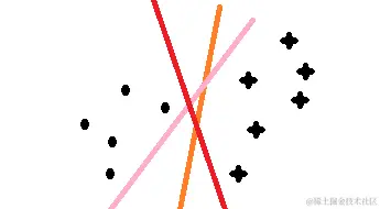 最近在学习svm算法,借此文章记录自己的学习过程,在学习很多处借鉴了z老师的讲义和李航的统计,若有不足的地方,请海涵;svm算法通俗的理解在二维上,就是找一分割线把两类分开,问题是如下图三条颜色都可以把点和星划开,但哪条线是最优的呢,这就是我们要考虑的问题;