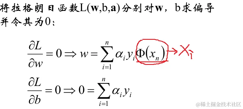 现在的优化方案到上面了,先求最小值,对 w 和 b 分别求偏导可以获取如下公式: