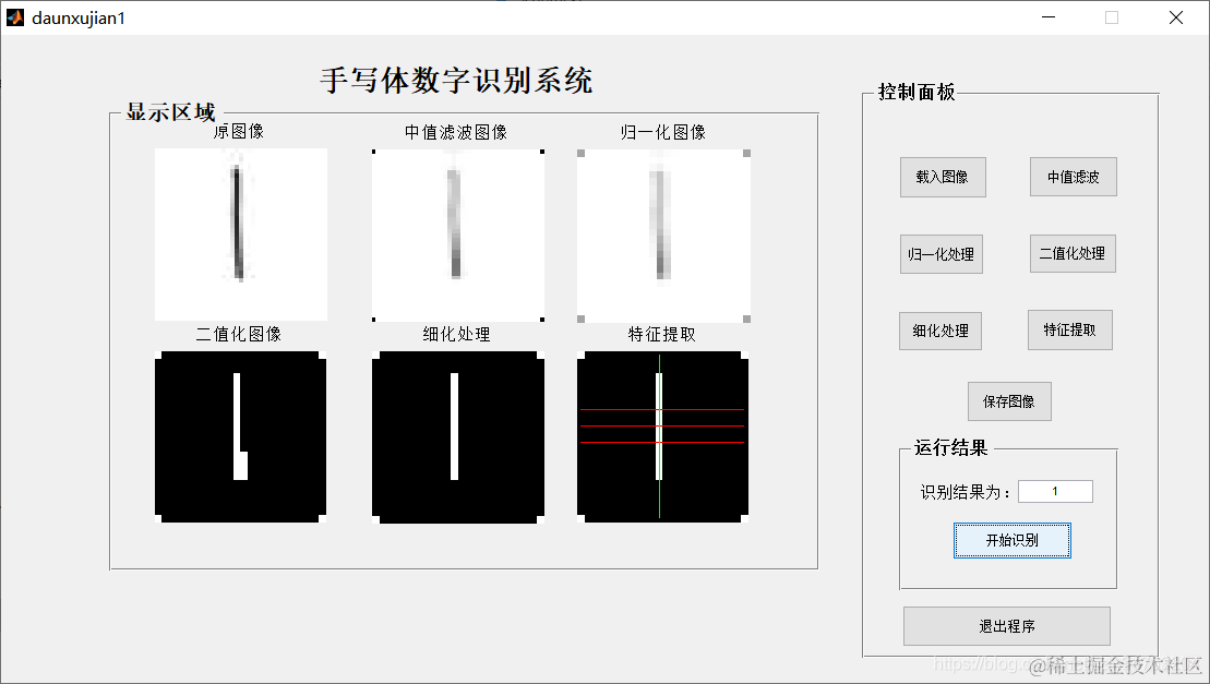 function varargout = daunxujian1(varargin) % DAUNXUJIAN1 MATLAB code for daunxujian1.fig % DAUNXUJIAN1, by itself, creates a new DAUNXUJIAN1 or raises the existing % singleton*. % % H = DAUNXUJIAN1 returns the handle to a new DAUNXUJIAN1 or the handle to % the existing singleton*. % % DAUNXUJIAN1('CALLBACK',hObject,eventData,handles,...) calls the local % function named CALLBACK in DAUNXUJIAN1.M with the given input arguments. % % DAUNXUJIAN1('Property','Value',...) creates a new DAUNXUJIAN1 or raises the % existing singleton*. Starting from the left, property value pairs are % applied to the GUI before daunxujian1_OpeningFcn gets called. An % unrecognized property name or invalid value makes property application % stop. All inputs are passed to daunxujian1_OpeningFcn via varargin. % % *See GUI Options on GUIDE's Tools menu. Choose "GUI allows only one % instance to run (singleton)". % % See also: GUIDE, GUIDATA, GUIHANDLES % Edit the above text to modify the response to help daunxujian1 % Last Modified by GUIDE v2.5 23-Oct-2020 21:52:34 % Begin initialization code - DO NOT EDIT gui_Singleton = 1; gui_State = struct('gui_Name', mfilename, ... 'gui_Singleton', gui_Singleton, ... 'gui_OpeningFcn', @daunxujian1_OpeningFcn, ... 'gui_OutputFcn', @daunxujian1_OutputFcn, ... 'gui_LayoutFcn', [] , ... 'gui_Callback', []); if nargin && ischar(varargin{1}) gui_State.gui_Callback = str2func(varargin{1}); end if nargout [varargout{1:nargout}] = gui_mainfcn(gui_State, varargin{:}); else gui_mainfcn(gui_State, varargin{:}); end % End initialization code - DO NOT EDIT % --- Executes just before daunxujian1 is made visible. function daunxujian1_OpeningFcn(hObject, eventdata, handles, varargin) % This function has no output args, see OutputFcn. % hObject handle to figure % eventdata reserved - to be defined in a future version of MATLAB % handles structure with handles and user data (see GUIDATA) % varargin command line arguments to daunxujian1 (see VARARGIN) % Choose default command line output for daunxujian1 handles.output = hObject; handles.Result = []; handles.File = []; % Update handles structure guidata(hObject, handles); clc; warning off all; InitAxes(handles); % UIWAIT makes daunxujian1 wait for user response (see UIRESUME) % uiwait(handles.figure1); % --- Outputs from this function are returned to the command line. function varargout = daunxujian1_OutputFcn(hObject, eventdata, handles) % varargout cell array for returning output args (see VARARGOUT); % hObject handle to figure % eventdata reserved - to be defined in a future version of MATLAB % handles structure with handles and user data (see GUIDATA) % Get default command line output from handles structure varargout{1} = handles.output; % --- Executes on button press in pushbutton1. function pushbutton1_Callback(hObject, eventdata, handles) % hObject handle to pushbutton1 (see GCBO) % eventdata reserved - to be defined in a future version of MATLAB % handles structure with handles and user data (see GUIDATA) [filename, pathname] = uigetfile({'*.jpg;*.tif;*.png;*.gif','All Image Files';... '*.*','All Files' },'载入图像',... fullfile(pwd, 'images')); I = imread(fullfile(pathname, filename)); Result = Process_Main(I); handles.File = fullfile(pathname, filename); handles.Result = Result; guidata(hObject, handles); InitAxes(handles) axes(handles.axes1); imshow(handles.Result.Image); title('原图像'); % --- Executes on button press in pushbutton2. function pushbutton2_Callback(hObject, eventdata, handles) % hObject handle to pushbutton2 (see GCBO) % eventdata reserved - to be defined in a future version of MATLAB % handles structure with handles and user data (see GUIDATA) if ~isempty(handles.Result) axes(handles.axes1); imshow(handles.Result.Image); title('原图像'); axes(handles.axes2); imshow(handles.Result.Medfilt); title('中值滤波图像'); end % --- Executes on button press in pushbutton3. function pushbutton3_Callback(hObject, eventdata, handles) % hObject handle to pushbutton3 (see GCBO) % eventdata reserved - to be defined in a future version of MATLAB % handles structure with handles and user data (see GUIDATA) if ~isempty(handles.Result) axes(handles.axes1); imshow(handles.Result.Image); title('原图像'); axes(handles.axes2); imshow(handles.Result.Medfilt); title('中值滤波图像'); axes(handles.axes3); imshow(handles.Result.Normalize); title('归一化图像'); end % --- Executes on button press in pushbutton4. function pushbutton4_Callback(hObject, eventdata, handles) % hObject handle to pushbutton4 (see GCBO) % eventdata reserved - to be defined in a future version of MATLAB % handles structure with handles and user data (see GUIDATA) if ~isempty(handles.Result) axes(handles.axes1); imshow(handles.Result.Image); title('原图像'); axes(handles.axes2); imshow(handles.Result.Medfilt); title('中值滤波图像'); axes(handles.axes3); imshow(handles.Result.Normalize); title('归一化图像'); axes(handles.axes4); imshow(handles.Result.Bww); title('二值化图像'); end % --- Executes on button press in pushbutton6. function pushbutton6_Callback(hObject, eventdata, handles) % hObject handle to pushbutton6 (see GCBO) % eventdata reserved - to be defined in a future version of MATLAB % handles structure with handles and user data (see GUIDATA) if ~isempty(handles.Result) axes(handles.axes1); imshow(handles.Result.Image); title('原图像'); axes(handles.axes2); imshow(handles.Result.Medfilt); title('中值滤波图像'); axes(handles.axes3); imshow(handles.Result.Normalize); title('归一化图像'); axes(handles.axes4); imshow(handles.Result.Bww); title('二值化图像'); axes(handles.axes6); imshow(handles.Result.Thin); title('细化处理'); axes(handles.axes5); imshow(handles.Result.Bw); title('特征提取'); hold on; h = []; for i = 1 : length(handles.Result.hs) %绘制水平线 h = [h plot([1 handles.Result.sz(2)], [handles.Result.hs(i) handles.Result.hs(i)], 'r-')]; end for i = 1 : length(handles.Result.vs)%绘