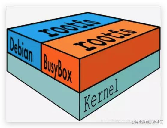 所以 Docker 可以同时支持多种 Linux 镜像,模拟出多种操作系统环境。Debian 和 BusyBox(一种嵌入式 Linux)上层提供各自的 rootfs,底层共用 Docker Host 的 kernel。