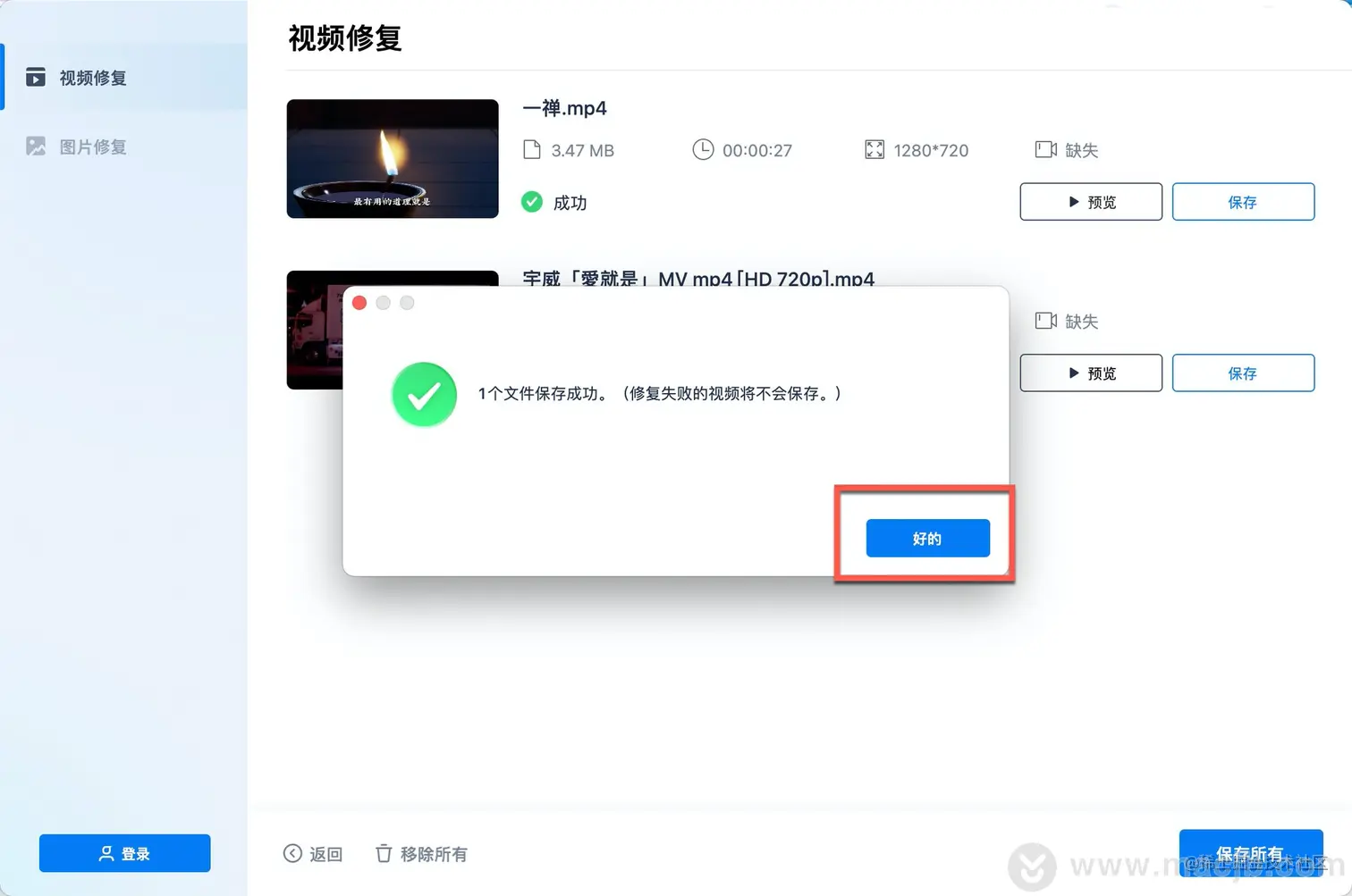 点击修复视频选项。修复机制完成后,将出现一个窗口,显示视频修复已完成。单击“确定”保存并预览修复后的视频。