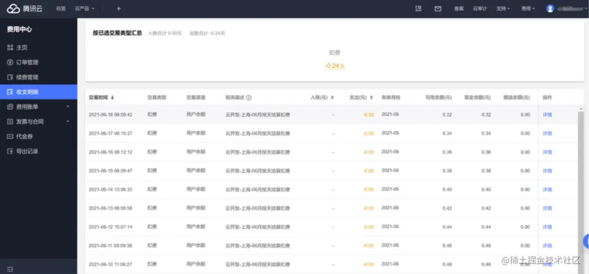 腾讯云CloudBase控制台:资源总览中查看用量,可前往收支明细中查看所有扣费信息: