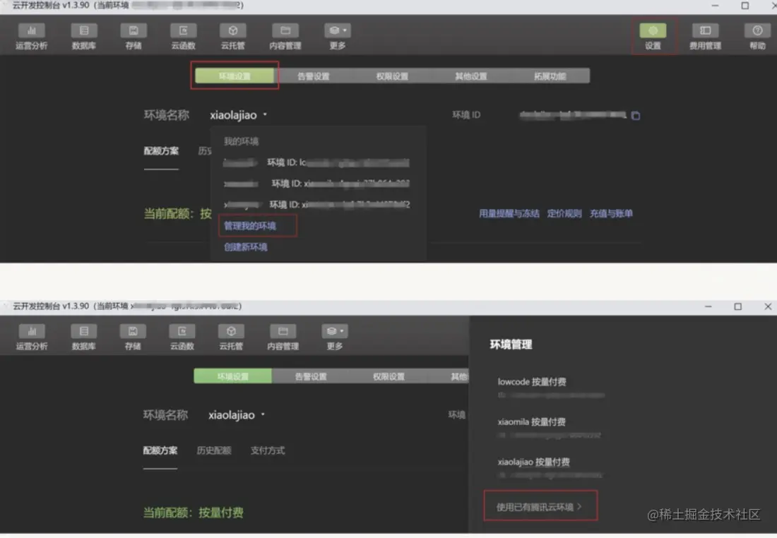 华哥:云开发已推出环境转换功能,只需在最新版微信开发者工具->设置->环境设置,点击环境名称- >管理我的环境->使用已有腾讯云环境,选择所需腾讯云环境,即可在微信云开发控制台使用该环境: