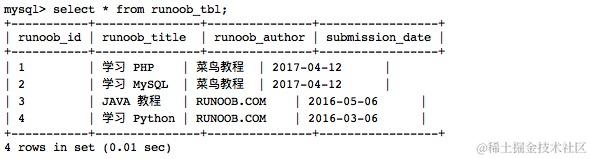在以上实例中,我们并没有提供 runoob_id 的数据,因为该字段我们在创建表的时候已经设置它为 AUTO_INCREMENT(自动增加) 属性。 所以,该字段会自动递增而不需要我们去设置。实例中 NOW() 是一个 MySQL 函数,该函数返回日期和时间。