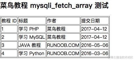 <?php $dbhost = 'localhost'; // mysql服务器主机地址 $dbuser = 'root'; // mysql用户名 $dbpass = '123456'; // mysql用户名密码 $conn = mysqli_connect($dbhost, $dbuser, $dbpass); if(! $conn ) { die('连接失败: ' . mysqli_error($conn)); } // 设置编码,防止中文乱码 mysqli_query($conn , "set names utf8"); $sql = 'SELECT runoob_id, runoob_title, runoob_author, submission_date FROM runoob_tbl'; mysqli_select_db( $conn, 'RUNOOB' ); $retval = mysqli_query( $conn, $sql ); if(! $retval ) { die('无法读取数据: ' . mysqli_error($conn)); } echo '<h2>菜鸟教程 mysqli_fetch_array 测试</h2>'; echo '<table border="1"><tr><td>教程 ID</td><td>标题</td><td>作者</td><td>提交日期</td></tr>'; while($row = mysqli_fetch_array($retval, MYSQLI_ASSOC)) { echo "<tr><td> {$row['runoob_id']}</td> ". "<td>{$row['runoob_title']} </td> ". "<td>{$row['runoob_author']} </td> ". "<td>{$row['submission_date']} </td> ". "</tr>"; } echo '</table>'; mysqli_close($conn); ?>