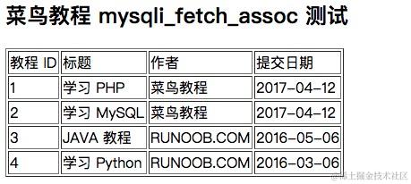 <?php $dbhost = 'localhost:3306'; // mysql服务器主机地址 $dbuser = 'root'; // mysql用户名 $dbpass = '123456'; // mysql用户名密码 $conn = mysqli_connect($dbhost, $dbuser, $dbpass); if(! $conn ) { die('连接失败: ' . mysqli_error($conn)); } // 设置编码,防止中文乱码 mysqli_query($conn , "set names utf8"); $sql = 'SELECT runoob_id, runoob_title, runoob_author, submission_date FROM runoob_tbl'; mysqli_select_db( $conn, 'RUNOOB' ); $retval = mysqli_query( $conn, $sql ); if(! $retval ) { die('无法读取数据: ' . mysqli_error($conn)); } echo '<h2>菜鸟教程 mysqli_fetch_assoc 测试</h2>'; echo '<table border="1"><tr><td>教程 ID</td><td>标题</td><td>作者</td><td>提交日期</td></tr>'; while($row = mysqli_fetch_assoc($retval)) { echo "<tr><td> {$row['runoob_id']}</td> ". "<td>{$row['runoob_title']} </td> ". "<td>{$row['runoob_author']} </td> ". "<td>{$row['submission_date']} </td> ". "</tr>"; } echo '</table>'; mysqli_close($conn); ?>