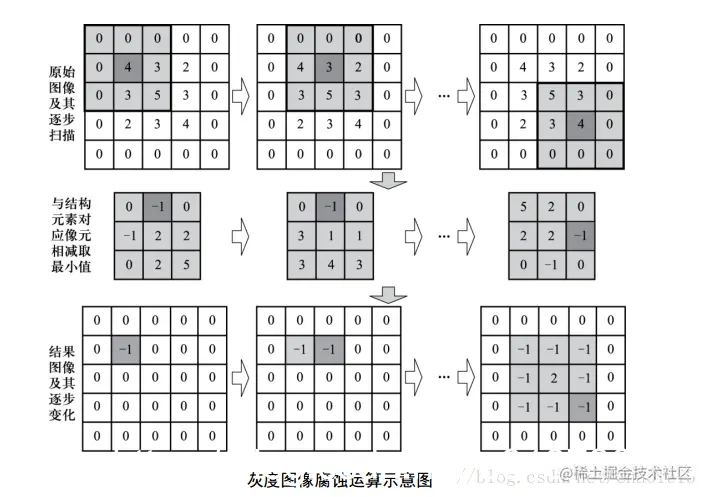 那么灰度形态学中的腐蚀就是类似卷积的一种操作,用P减去结构元素B形成的小矩形,取其中最小值赋到对应原点的位置即可。