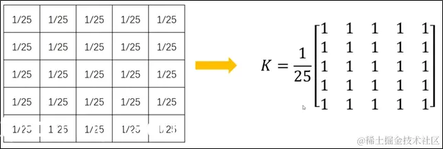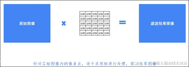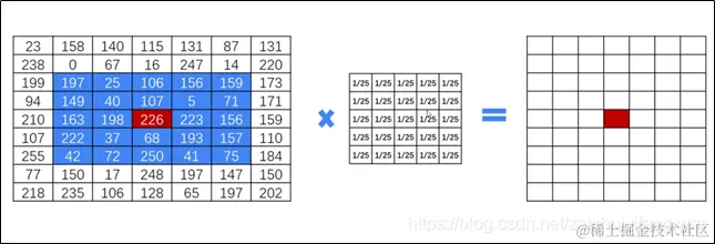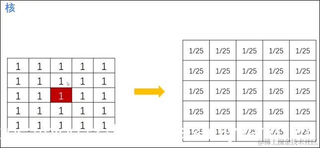其中55的矩阵称为核,针对原始图像内的像素点,采用核进行处理,得到结果图像,如下图所示: