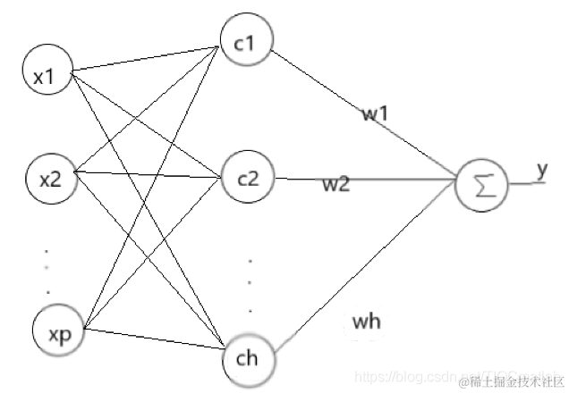 RBF神将网络是一种三层神经网络,其包括输入层、隐层、输出层。从输入空间到隐层空间的变换是非线性的,而从隐层空间到输出层空间变换是线性的。流图如下: