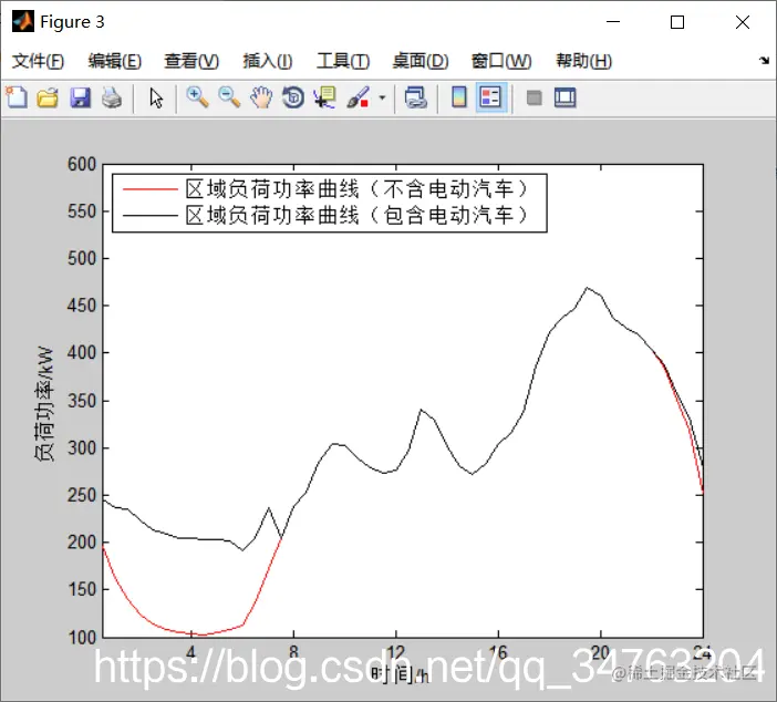 legend('区域负荷功率曲线(不含电动汽车)','location','northwest','区域负荷功率曲线(包含电动汽车)','location','northwest')
