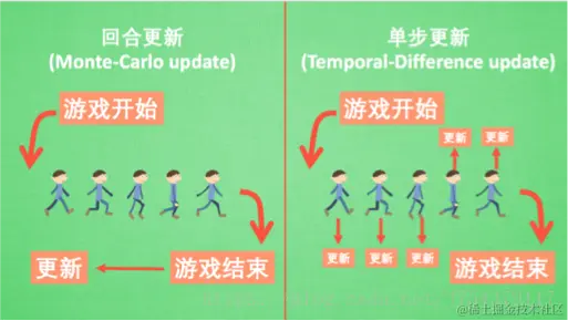 上面的动态规划方法,是一种较为理想的状态,即所有的参数都提前知道,比如状态转移概率,及奖励等等。然而显示情况是未知的,这时候有一种手段是采用蒙特卡洛采样,基于大数定律,基于统计计算出转移概率值;比如当你抛硬币的次数足够多,那么正面和反面的概率将会越来越接近真实情况。
