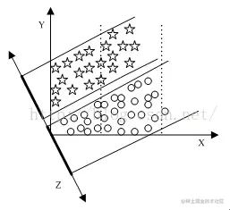 在图2中,有一些离散的二维分布点,其中五角星表示一类集合,小圆圈表示另一类集合,假设这两个类别可以用特征X和特征Y进行描述,由图可知,在X轴和Y轴上这两个类别的投影是重叠的,表明这些点的两个特征X和Y没有表现出突出的识别性。但是两个类的投影在Z轴上区分度较大,显示出很好的识别性。PCA就是这样的一个工具,它可以产生非常好的降维效果,这种方法也可以用在图像处理的其他的一些研究中,如图像压缩、分类以及特征选择等。