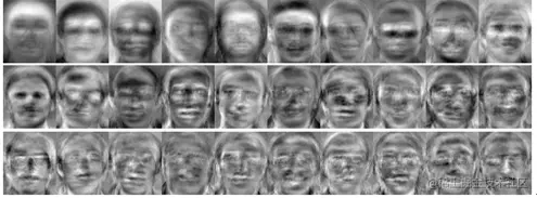 其中vi就是(5)中协方差矩阵的特征向量,p是特征向量的个数。将特征向量转化为矩阵,矩阵就可以表示图像,也即是所谓的特征脸,如下: