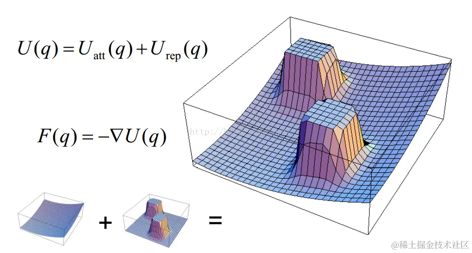 总的场就是斥力场合引力场的叠加,也就是U=U_att+U_rep,总的力也是对对应的分力的叠加,如下图所示: