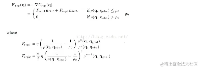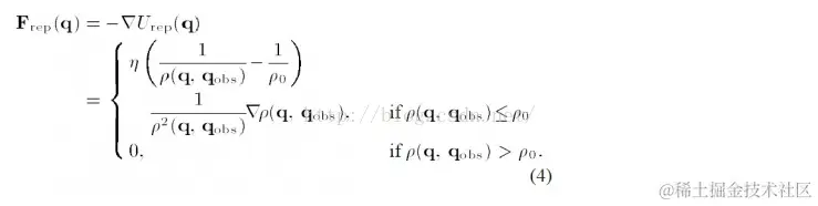 公式(3)是传统的斥力场公式,现在还没有搞清楚是怎么推导出来的。公式中η是斥力尺度因子,ρ(q,q_obs)代表物体和障碍物之间的距离。ρ_0代表每个障碍物的影响半径。换言之,离开一定的距离,障碍物就对物体没有斥力影响。
