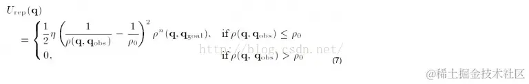 这里的ε是尺度因子.ρ(q,q_goal)表示物体当前状态与目标的距离。引力场有了,那么引力就是引力场对距离的导数(类比物理里面W=FX):