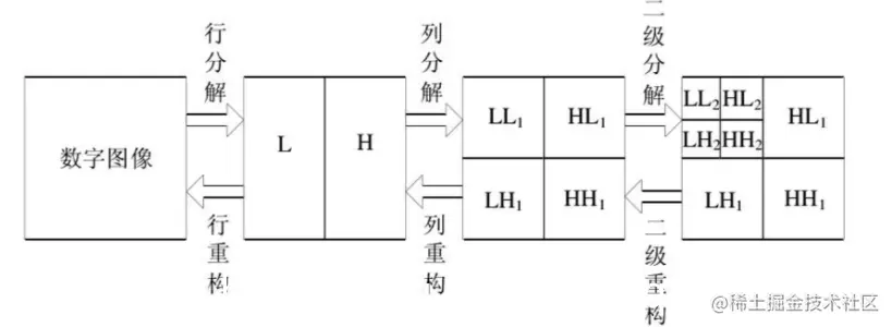 图像的二维离散小波分解和重构过程如下图所示,分解过程可描述为:首先对图像的每一行进行 1D-DWT,获得原始图像在水平方向上的低频分量 L 和高频分量 H,然后对变换所得数据的每一列进行 1D-DWT,获得原始图像在水平和垂直方向上的低频分量 LL、水平方向上的低频和垂直方向上的高频 LH、水平方向上的高频和垂直方向上的低频 HL 以及水平和垂直方向上的的高频分量 HH。